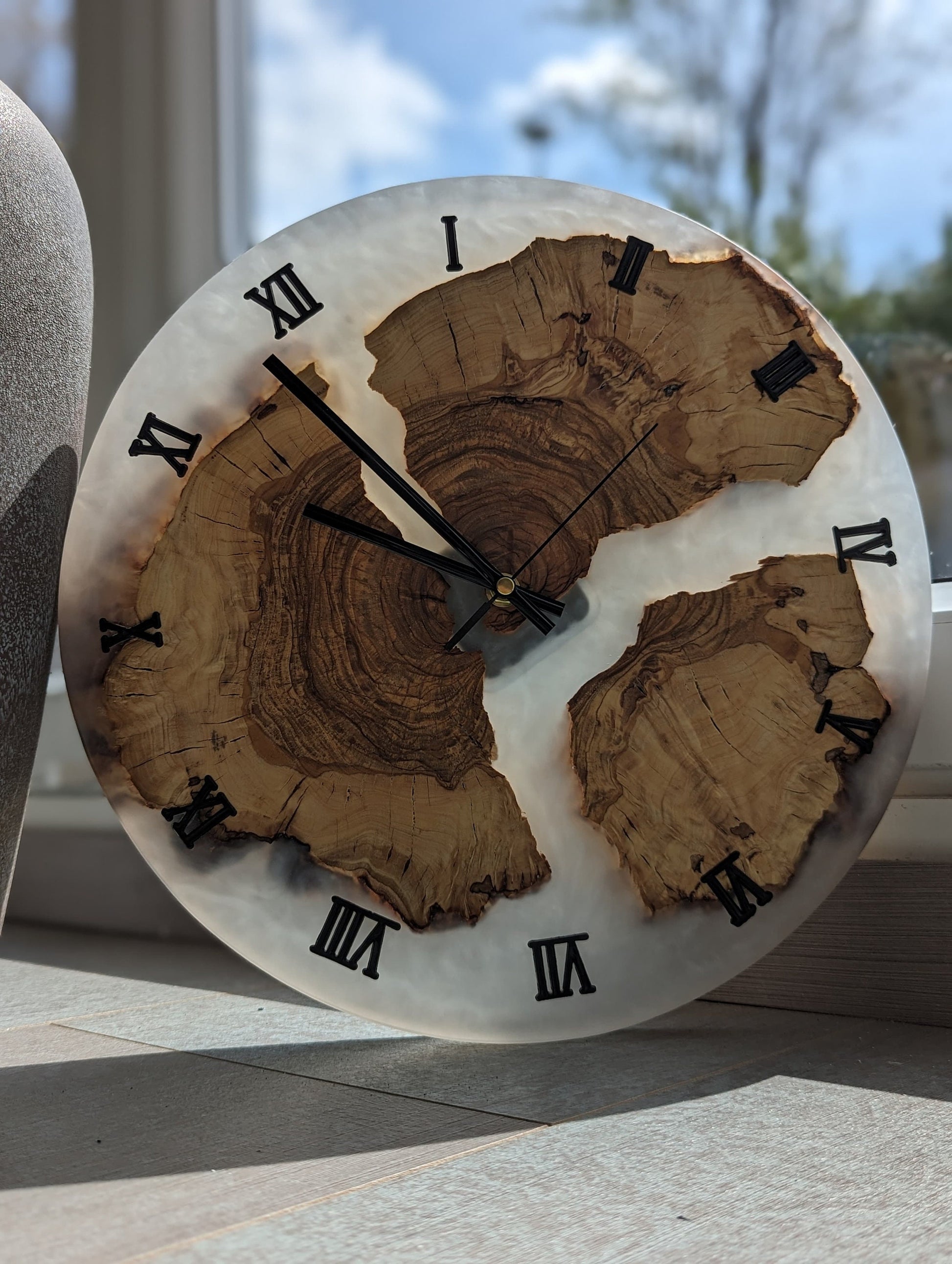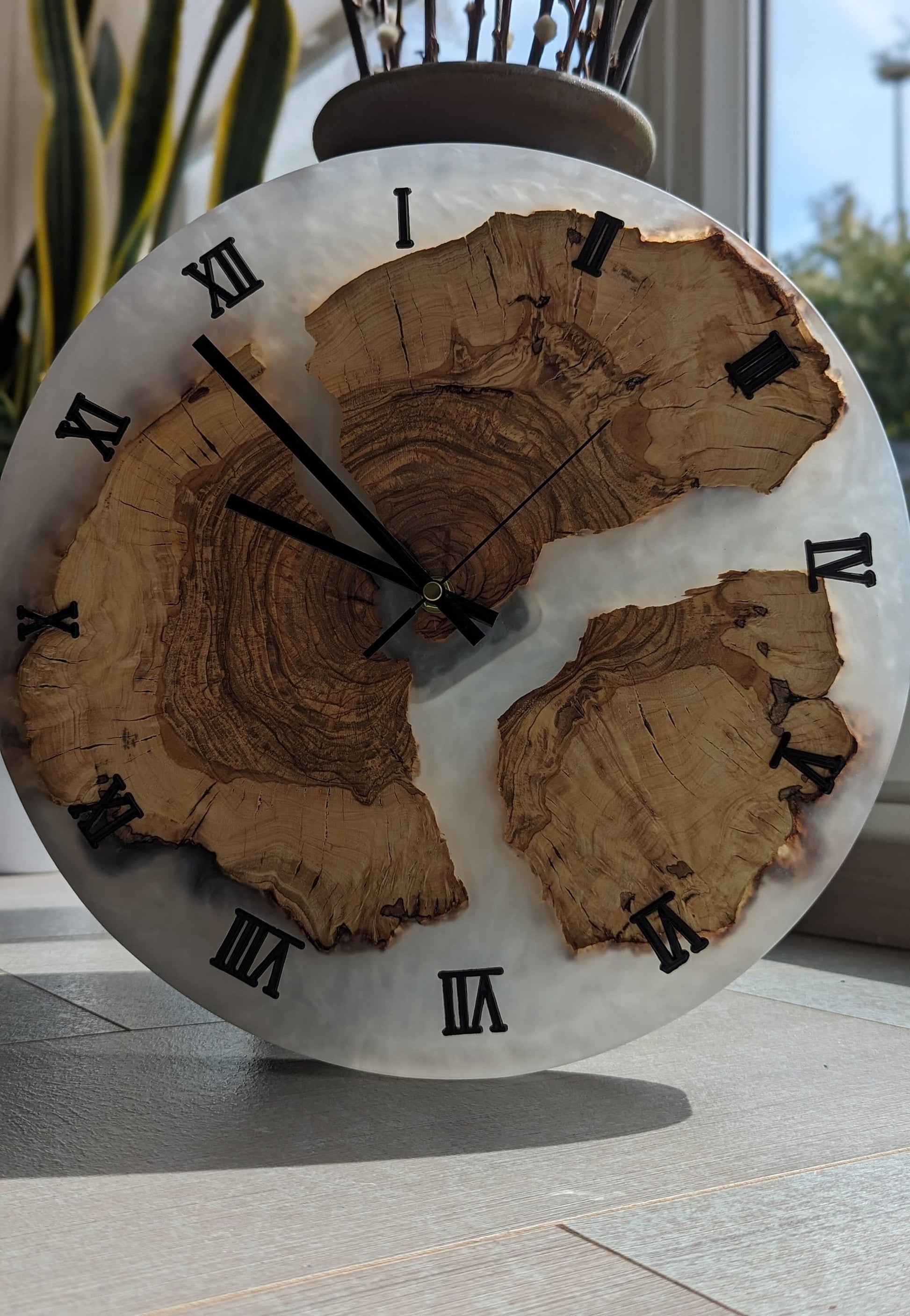 Liebe zum Detail ist bei uns Trumpf: Wir vereinen Holz und Epoxid in einer einzigartigen Kunstform. Jede Uhr, die wir herstellen, ist ein Unikat, gefertigt nach Kundenwunsch in verschiedenen Farben und Größen. Die Uhrzeiger bewegen sich klassisch dank des leisen Quarzuhrwerks, welches von Hand montiert wird. Die handgefertigte Uhr ist ein besonderes Kunstwerk, das jeden Raum bereichert.
