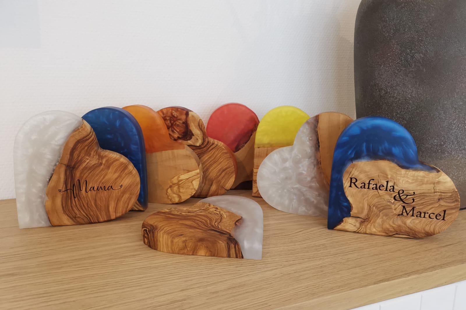 Mache dich selbst oder deine Lieben glücklich und bestelle jetzt dein Herz aus Olivenholz und Epoxid.