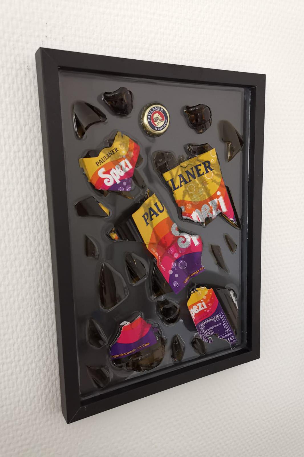 Diese handgefertigte Skulptur vereint die künstlerische Vision mit einem Hauch von Industriechic. Die zerbrochene Paulaner Spezi Flasche wurde kunstvoll in verschiedenen Formen und Winkeln angeordnet, um eine beeindruckende visuelle Darstellung von Kontrast und Kreativität zu schaffen.