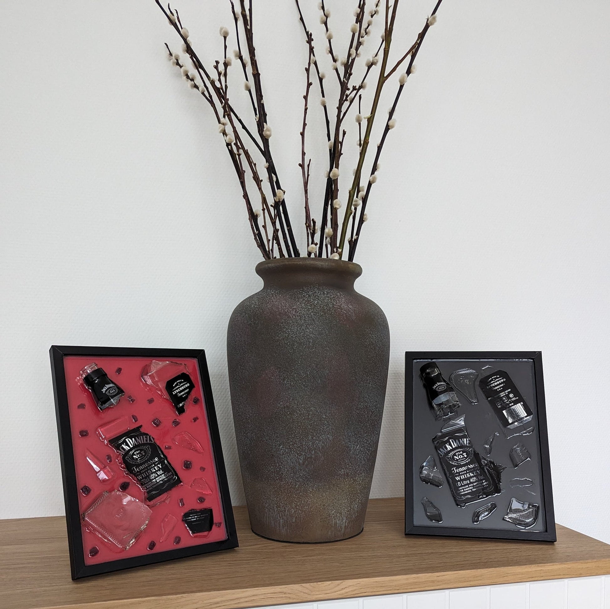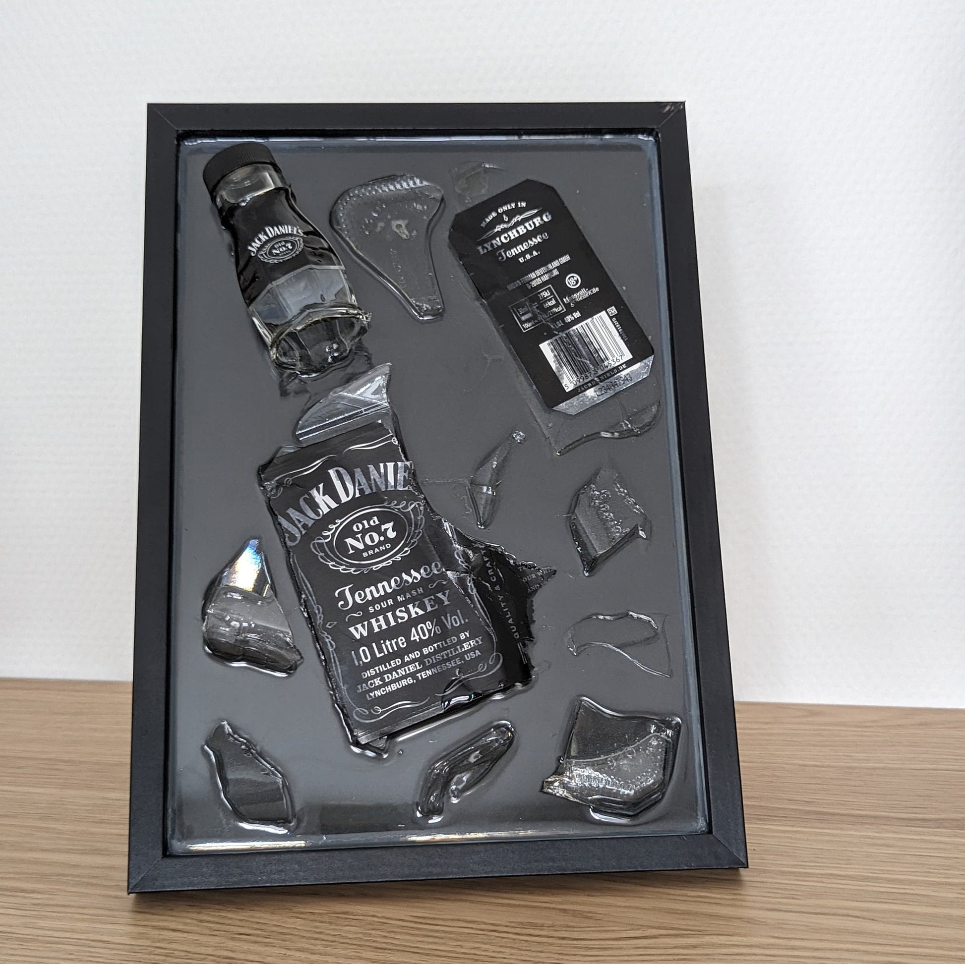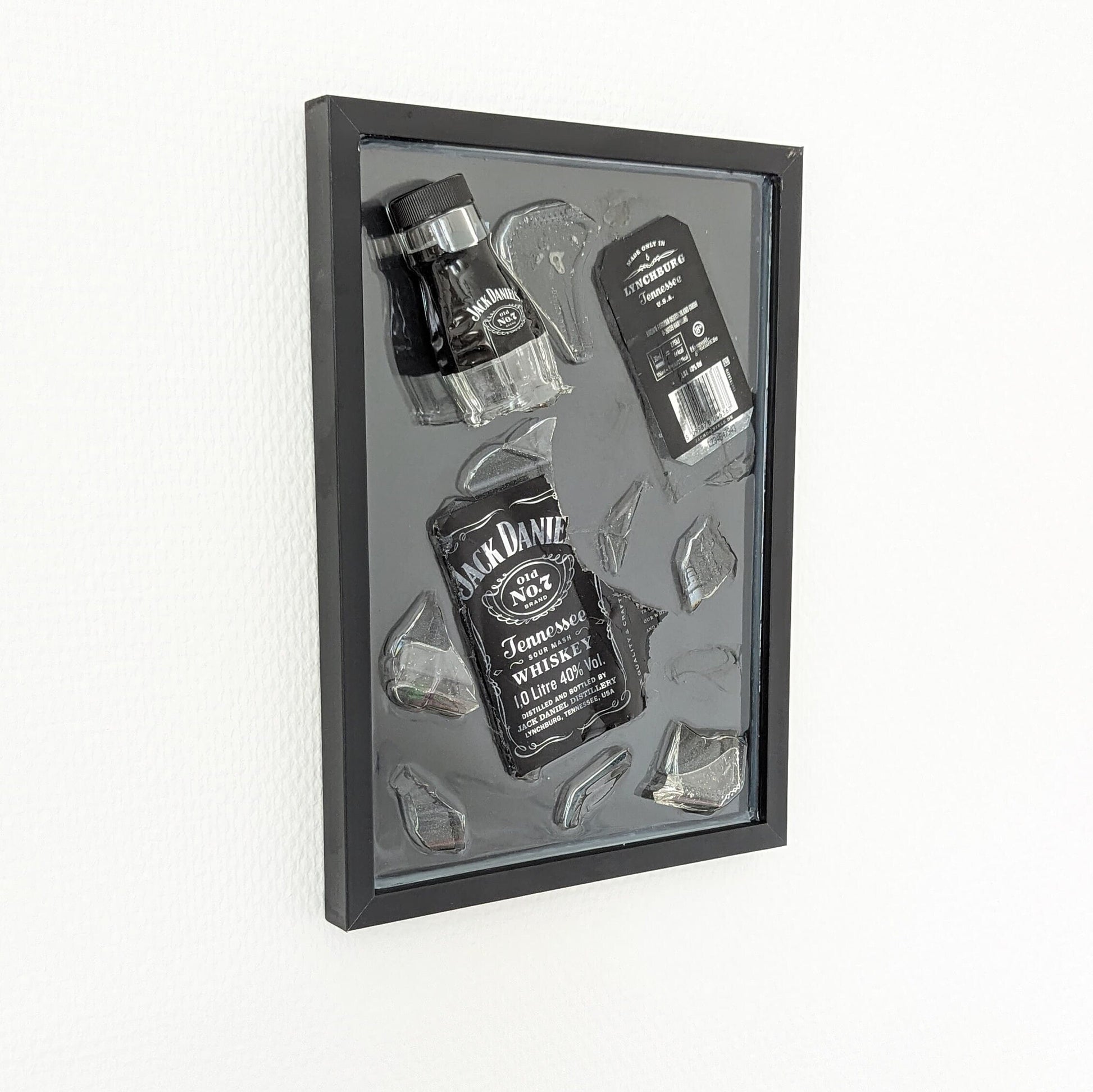 Diese handgefertigte Skulptur vereint die künstlerische Vision mit einem Hauch von Industriechic. Die zerbrochene Jack Daniel's Flasche wurde kunstvoll in verschiedenen Formen und Winkeln angeordnet, um eine beeindruckende visuelle Darstellung von Kontrast und Kreativität zu schaffen.
