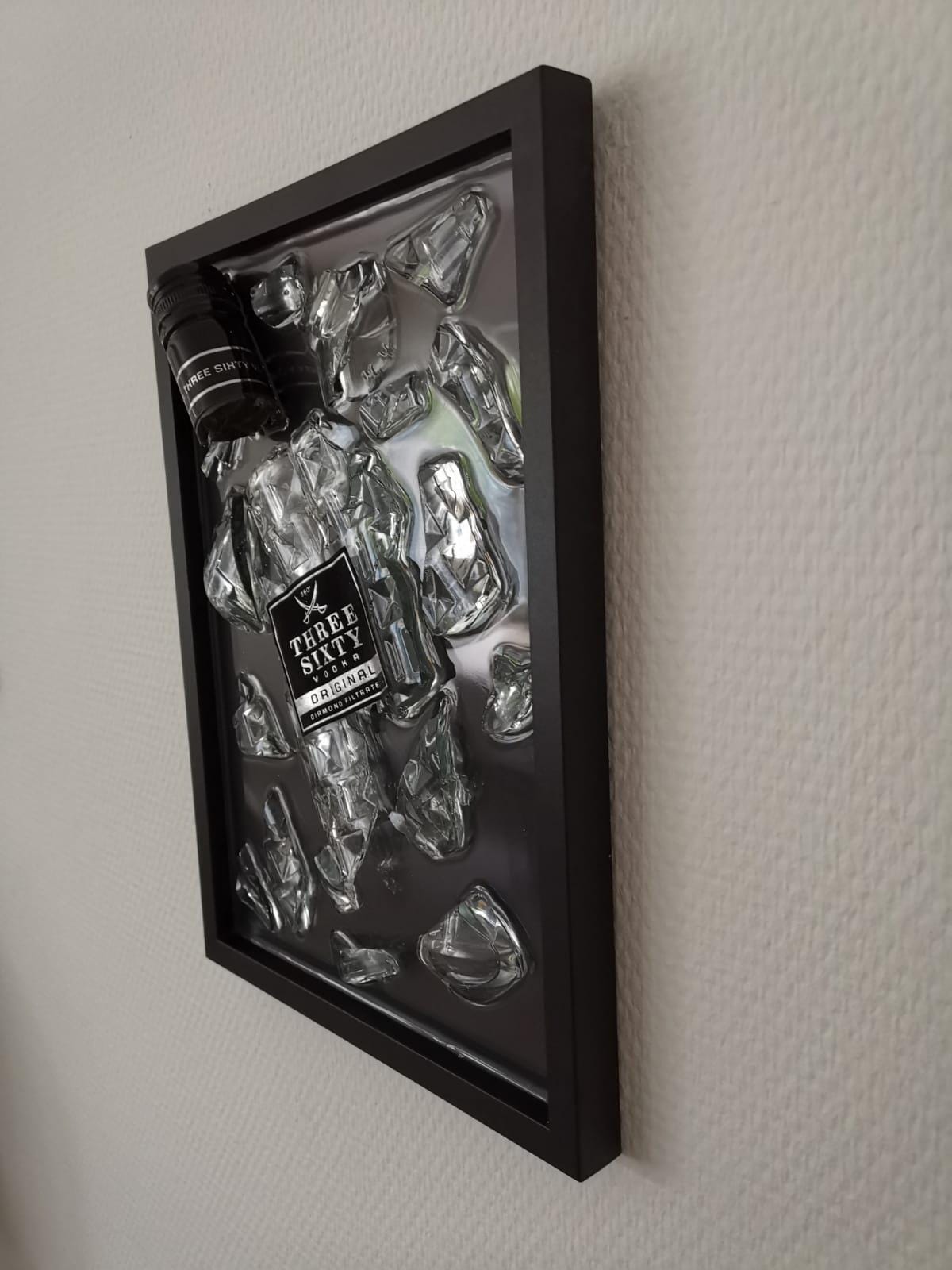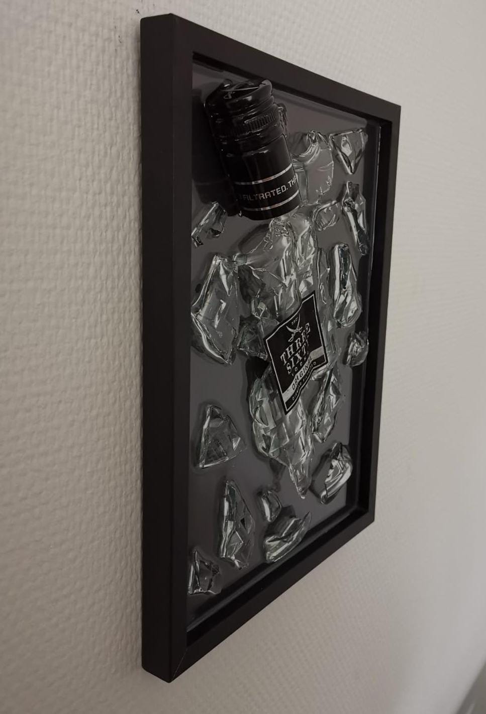 Diese handgefertigte Skulptur vereint die künstlerische Vision mit einem Hauch von Industriechic. Die zerbrochene Three sixty Flasche wurde kunstvoll in verschiedenen Formen und Winkeln angeordnet, um eine beeindruckende visuelle Darstellung von Kontrast und Kreativität zu schaffen.